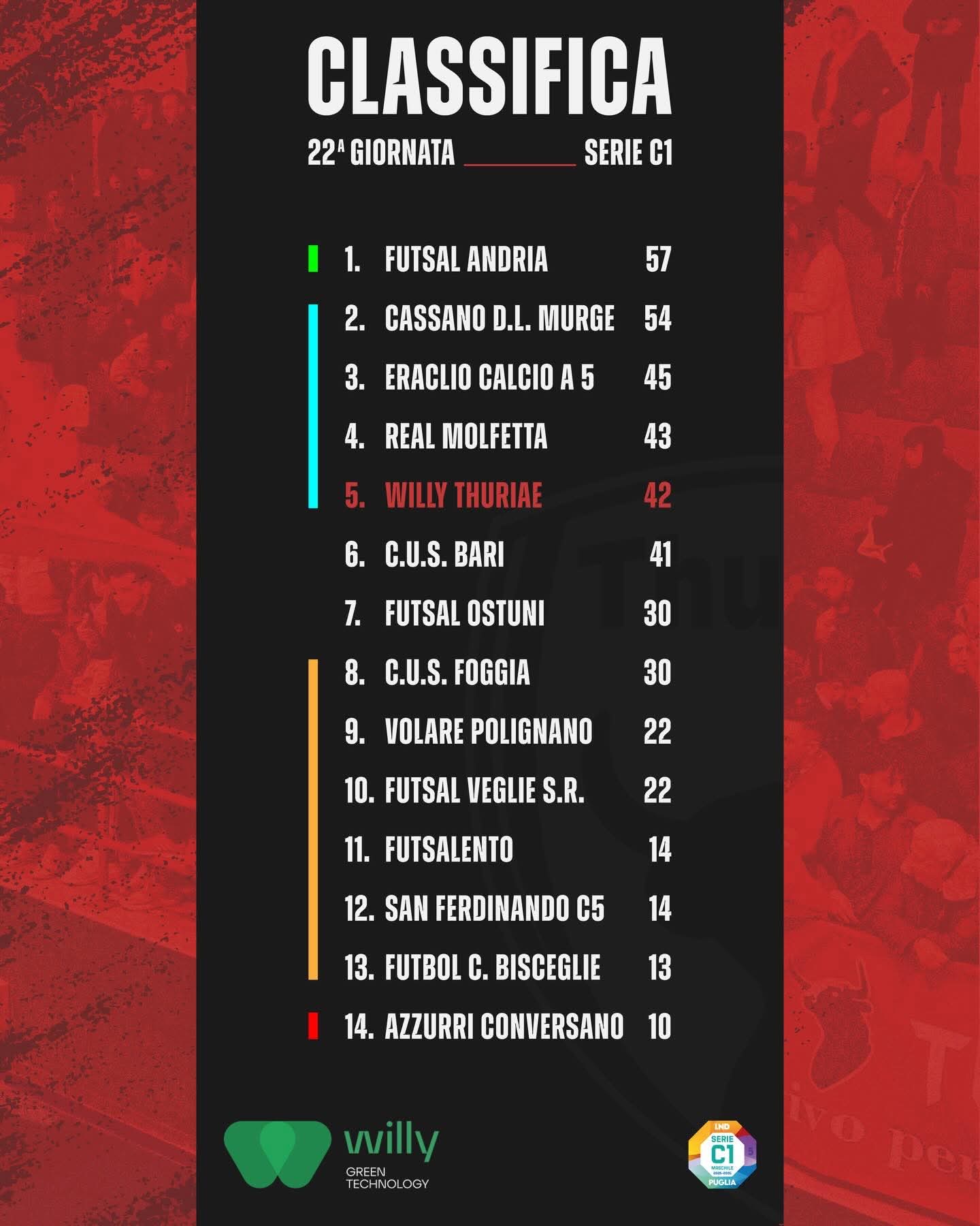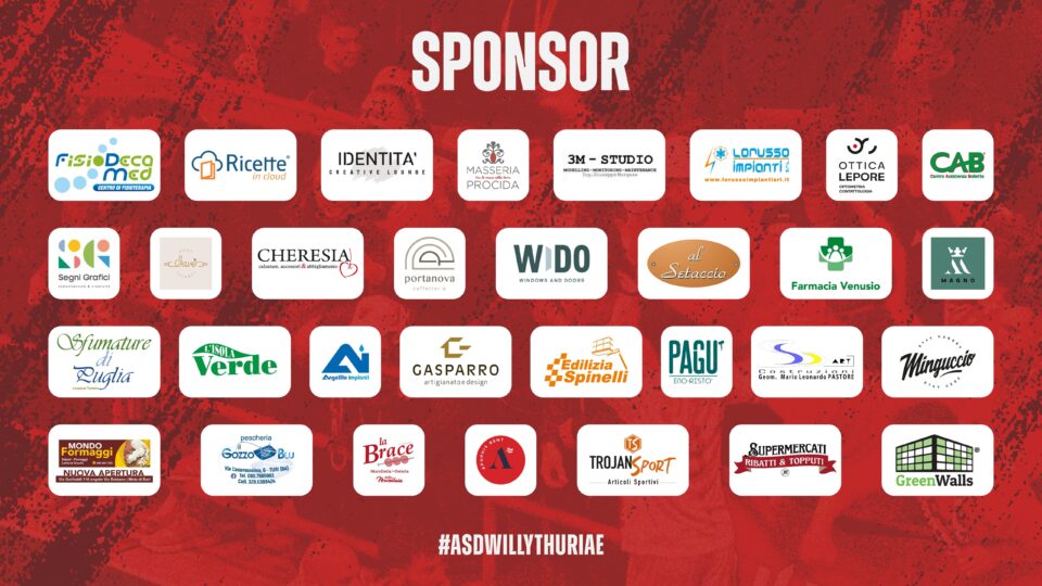 Benvenuti sul sito ufficiale dell’ASD Willy Thuriae, storica realtà del calcio a cinque turese. Qui potrete trovare info, notizie e risultati di tutte le compagini rosso-granata, da quelli della Prima Squadra, iscritta al campionato di serie C1 2025/2026, a quelli di tutto il settore giovanile.